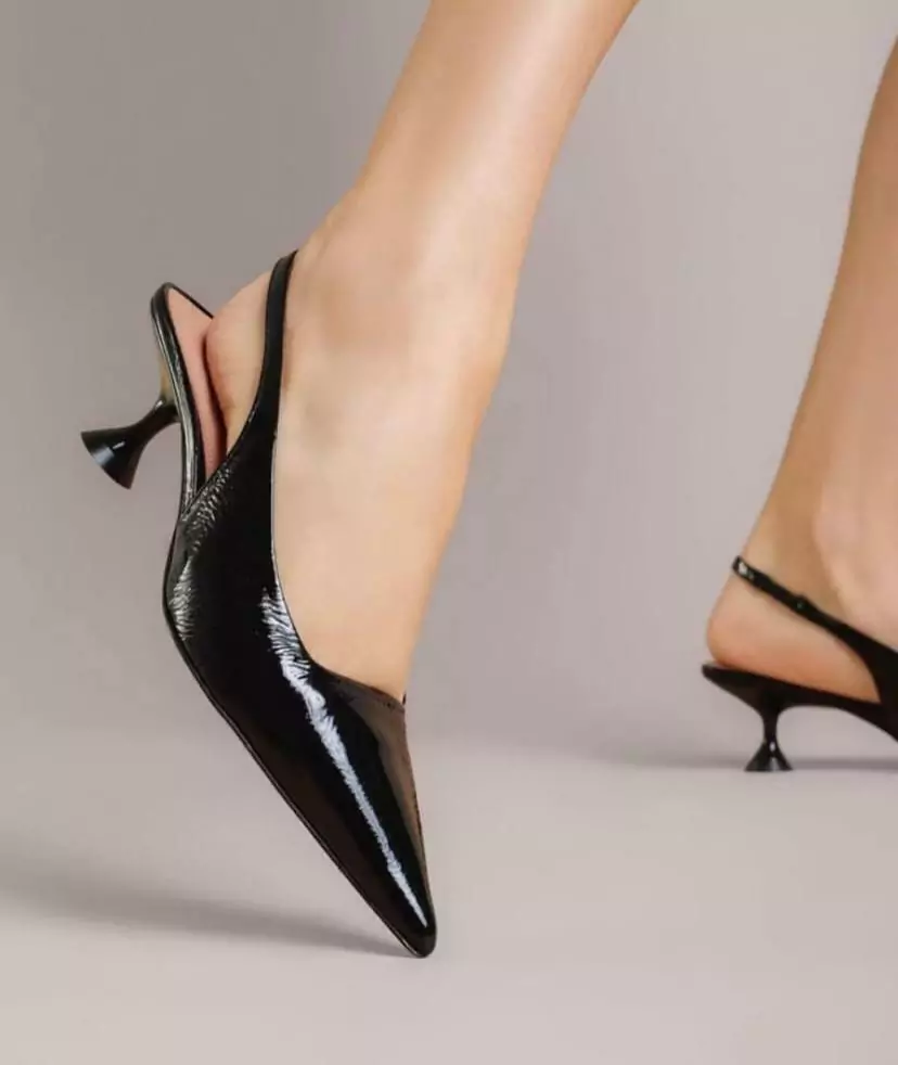 Um clássico renovado! O slingback de bico fino surge em verniz preto e salto médio. Perfeito para compor looks com elegância e um toque imponente.
